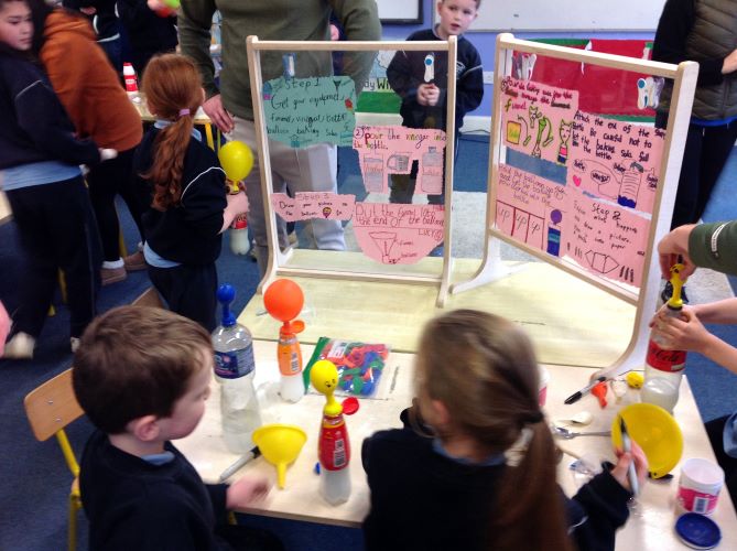 Parents were invited into see the children’s Science experiments. In Junior and Senior infants the children showed their parents capillary colours in action and made a skittle rainbow. In First and Second class the children inflated a balloon using vinegar and baking powder. In Third and Fourth the children asked parents to find a transparent, opaque and translucent light source using torches. In Fifth and Sixth the children showed sugar content in food we eat, the affects of different liquids on coins and STEM creations.